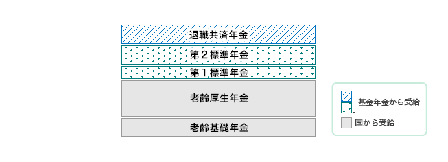 | 老齢給付金 (第2標準年金) | 障害給付金 | 退職共済年金 | 退職共済年金 (みなし退職年金) | 障害共済年金 | |